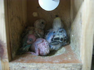 Foto 1, 2, 3 e 4 - Os meus três Periquitos bebes do meu casal fêmea albina/macho verde