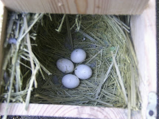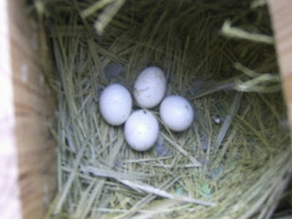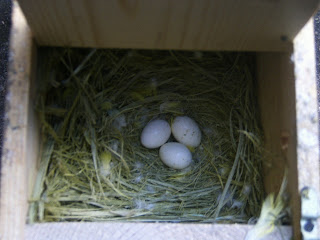 Foto 2, 3 e 4 - Os cinco ovos do meu casal fêmea amarela/macho azul (foto 1)