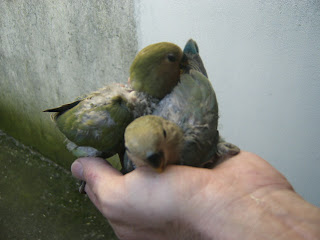 Foto 1, 2 e 3 - Os meus três Roseicollis bebes do meu casal fêmea amarela/macho azul