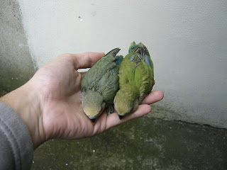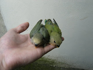 Foto 1 e 2 - As minhas duas crias de Roseicollis que já sairam do ninho do meu casal fêmea verde aqua/macho verde