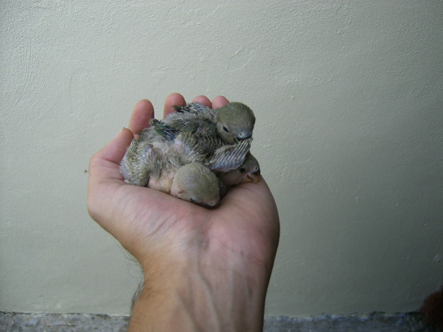Foto 12, 13 e 14 - Os meus quatro Roseicollis bebes do meu casal fêmea violeta/macho verde oliva