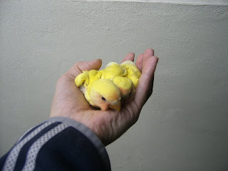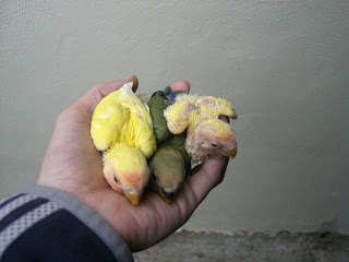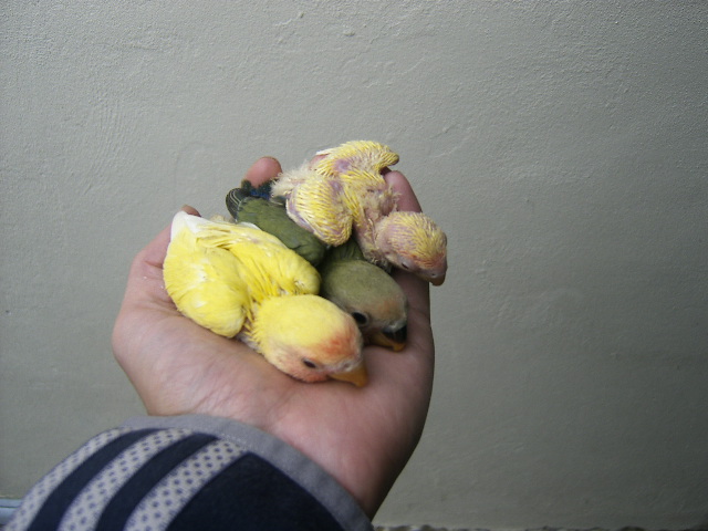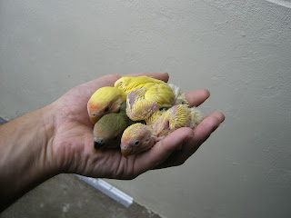 Foto 1, 2 e 3 - Os meus quatro Fischers bebes do meu casal fêmea amarela/macho pastel