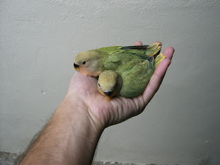 Foto 10, 11 e 12 - Os meus dois Roseicollis bebes do meu casal fêmea lutina face vermelha/macho lutino face laranja
