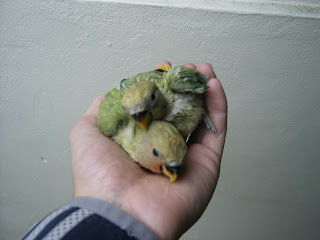 Foto 1, 2 e 3 - Os meus três Roseicollis bebes do meu casal fêmea verde face laranja/macho lutino face laranja