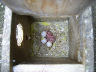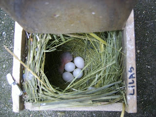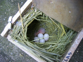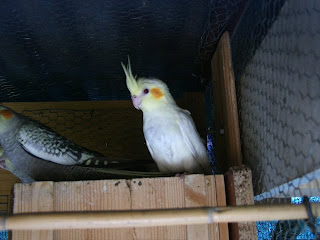 Foto 1 e 2 - A minha Caturra bebe adoptada pelo meu casal fêmea albina/macho cinzento face branca (adoptada do casal fêmea canela/macho amarelo)