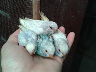 Foto 5 - Os quatro Periquitos bebes (+ 2 ovos) do meu casal fêmea lutina/macho opalino azul celeste