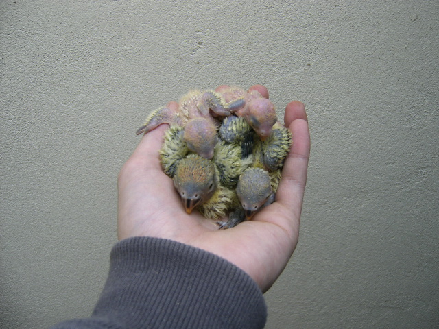 Foto 5 - As três Caturras bebes do meu casal fêmea pérola/macho cinzento, têm que estar a ser criadas à mão, uma vez que se não fosse o meu pai a ir ver o ninho naquele dia acontecia-lhe o mesmo que às duas irmãs mais novas que os pais mataram. Isto tudo com a pressa de voltar a criar, como tem acontecido ultimamente com os dois casais que têm criado. Como podem ver ainda se notam as marcas do que os pais lhes fizeram.