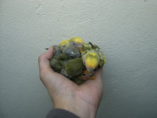 Foto 1 - As três Caturras pérolas que estão a ser criadas à mão. Já estão grandinhas e com as penas quase todas.
