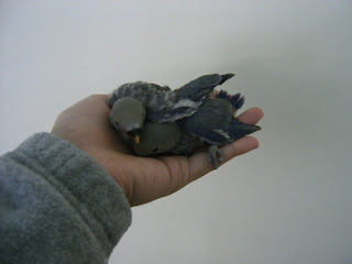 Foto 3 - Os três Roseicollis bebes (dois aquas e um asa rendada) que eram do meu casal fêmea aqua/macho asa rendada. Os pais deles andavam-se a portar mal a arrancarem-lhe as penas e a magoarem-nos. E aqui estão eles passado uma semana do meu pai os ter começado a criar à mão, muito mais bonitos e a ficarem grandinhos.
