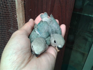 Foto 2 - Os três Periquito bebes a serem criados pelo meu casal fêmea lutina/macho opalino azul celeste
